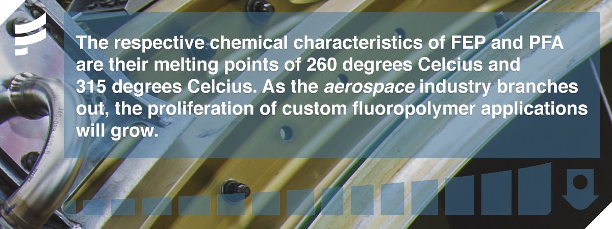 Finally, PTFE offers protection from volatile external weather environments, such as exposure to previously mentioned high temperature liquids like fuel, and low temperature conditions present in the upper atmosphere and space. Like PTFE, FEP and PFA exhibit similar qualities of high chemical resistance, protection against temperature volatility, and ability to be custom formed for respective aerospace applications. The respective chemical characteristics of FEP and PFA are their melting points of 260 degrees Celcius and 315 degrees Celcius. As the aerospace industry branches out, the proliferation of custom fluoropolymer applications will grow.