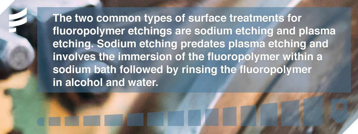 The two common types of surface treatments for fluoropolymer etchings are sodium etching and plasma etching. Sodium etching predates plasma etching and involves the immersion of the fluoropolymer within a sodium bath followed by rinsing the fluoropolymer in alcohol and water. Although a toxic process, sodium etching works by defluorinating, or removing the bonds between the carbon and fluorine atoms at the top of the material. By inspection, a fluoropolymer that has completed the etching process transitions from initially clear to a tinted brown color.
