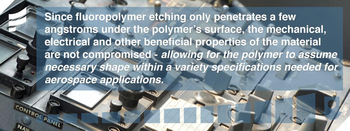 Since fluoropolymer etching only penetrates a few angstroms under the polymer’s surface, the mechanical, electrical and other beneficial properties of the material are not compromised – allowing for the polymer to assume necessary shape within a variety of specifications needed for aerospace applications. For example, the interior fuselage of an aircraft outfitted with a fluoropolymer lining will be able to effectively insulate passengers from external weather conditions without compromising factors such as vehicle weight, flammability, and passenger safety.